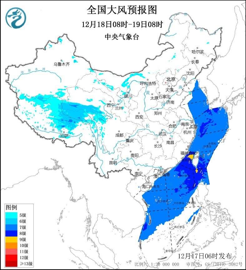 12月18日08时至19日08时,西藏中北部、青海南部、川西高原北部、内蒙古西部等地部分地区有5~6级、阵风7~8级的大风,其中,西藏东北部、青海南部、川西高原北部局地有7~8级、阵风10~11级的大风;黄海大部海域、东海、台湾海峡、台湾以东瀛面、南海大部海域、巴士海峡将有7~8级、阵风9级的大风,其中,台湾海峡和巴士海峡部分海域风力可达9级、阵风10~11级。