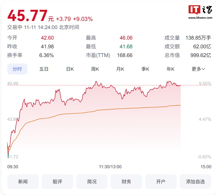 IT之家 11 月 11 日音讯,江淮汽车股价本日出现拉升,一度冲击涨停,总市值初度闭塞千亿大关。收尾IT之家发稿,江淮汽车股价为 45.77 元,涨幅 9.03%。据了解,在近一个半月内,江淮汽车的股价还是完了翻倍。