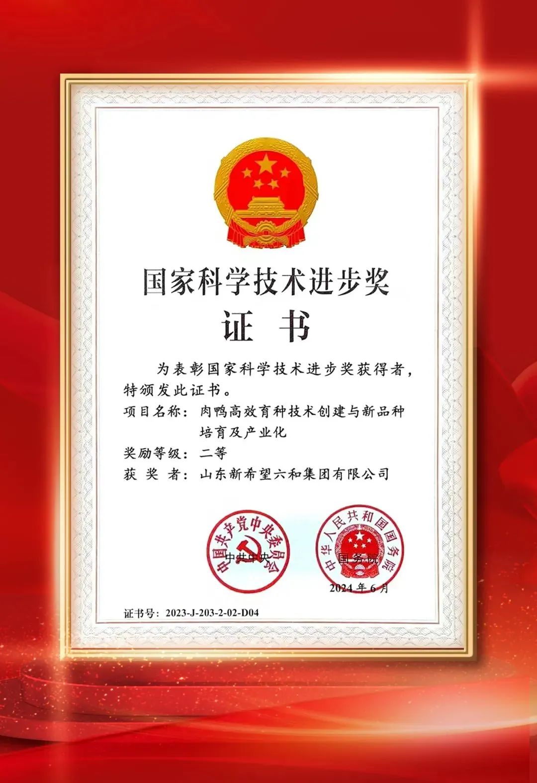 2024年6月24日,2023年度国度科学时间奖在京揭晓,新但愿六和荣获国度科技进步二等奖。